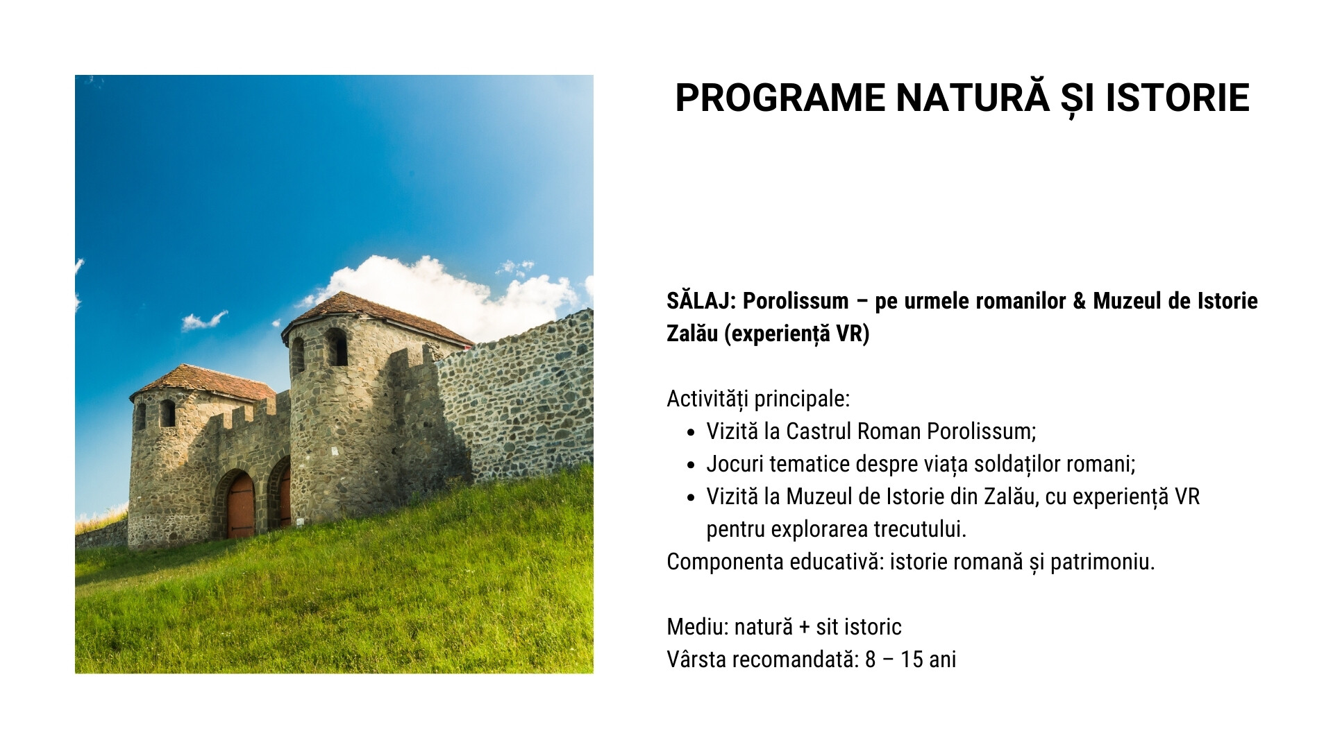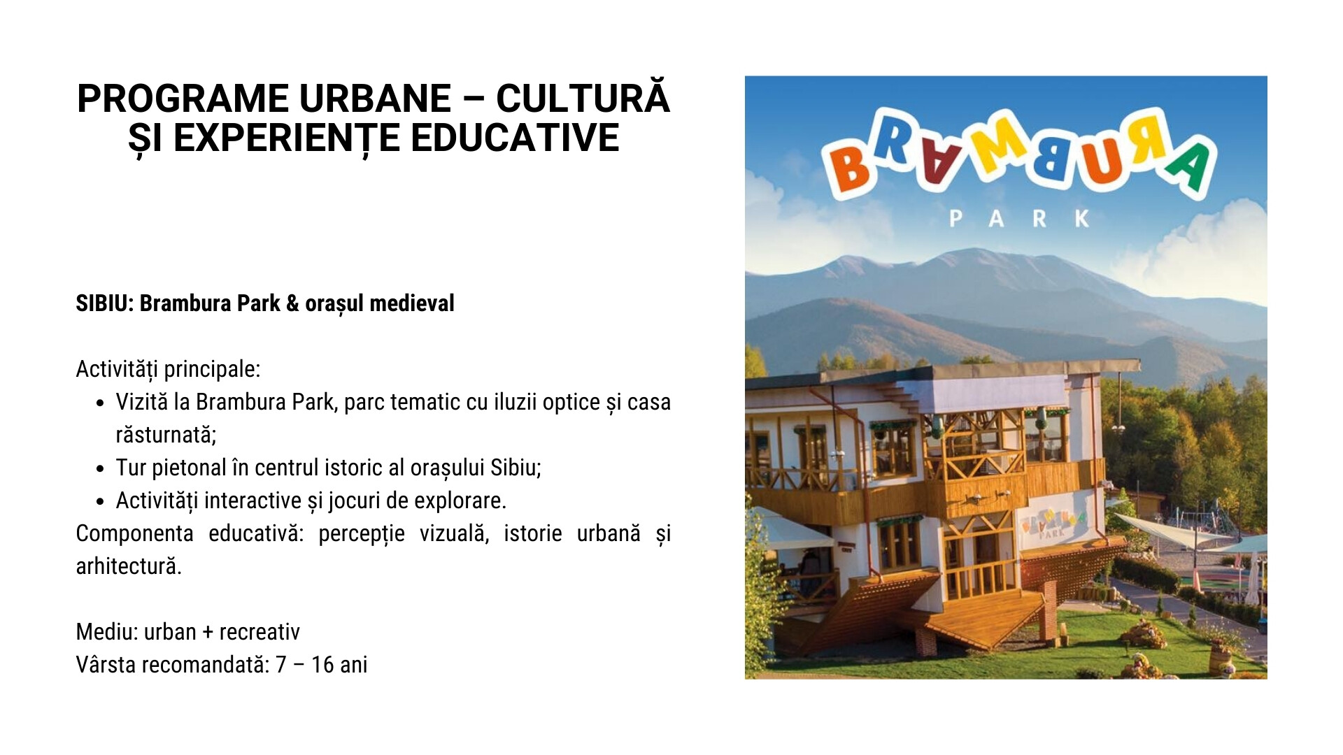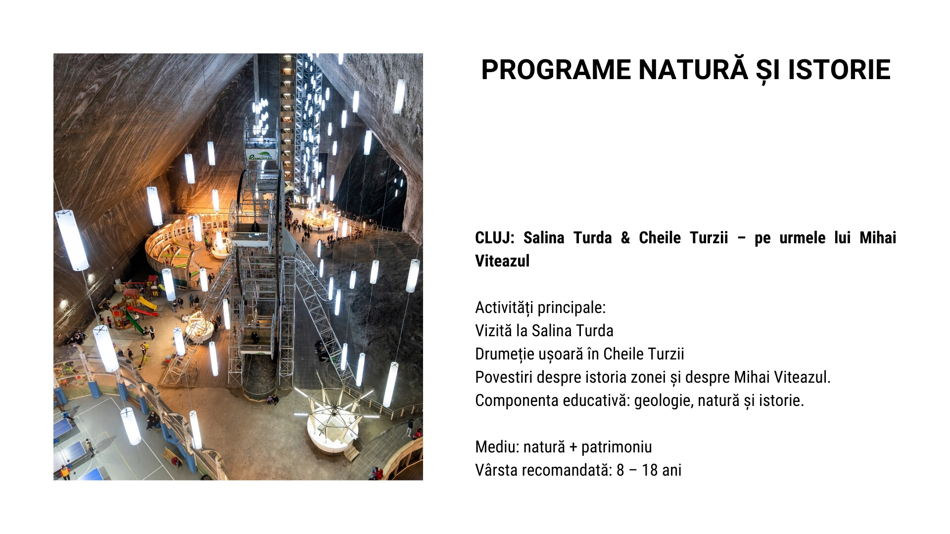 Printre destinațiile propuse pentru astfel de programe se pot regăsi: Sibiu – Gura Râului (Arka Park, Păltiniș), Predeal, vizită la Castelul Peleș, urcare cu telecabina la Cota 2000 – Babele, precum și programe educative în București (Parcul Herăstrău, Muzeul Antipa, Palatul Parlamentului – Casa Poporului, Muzeul Cotroceni).