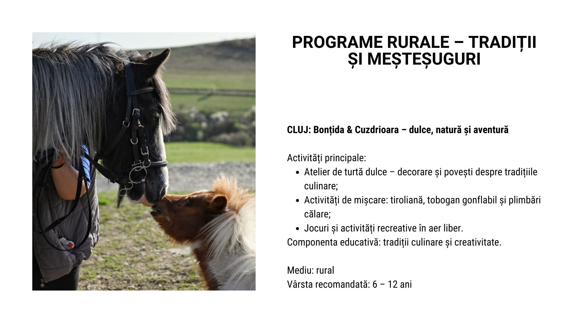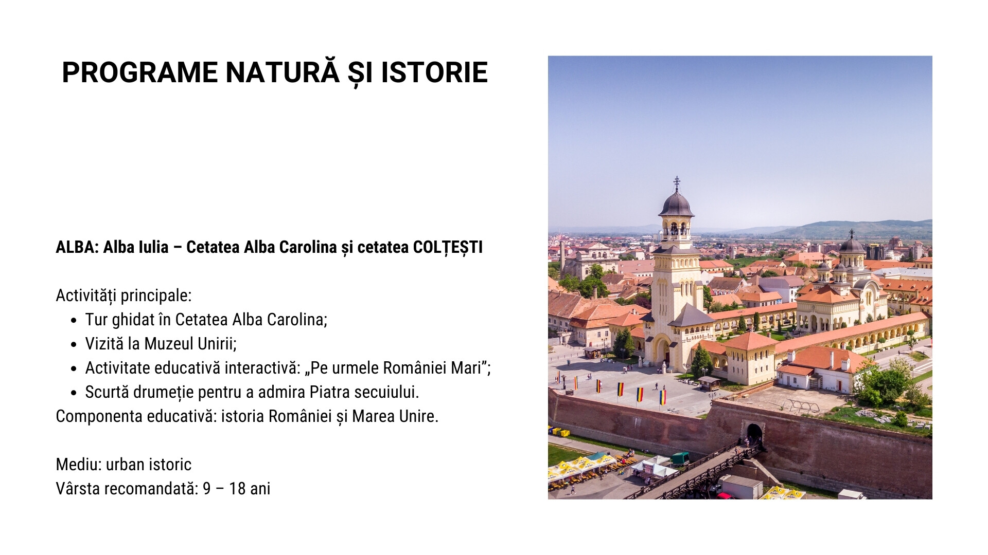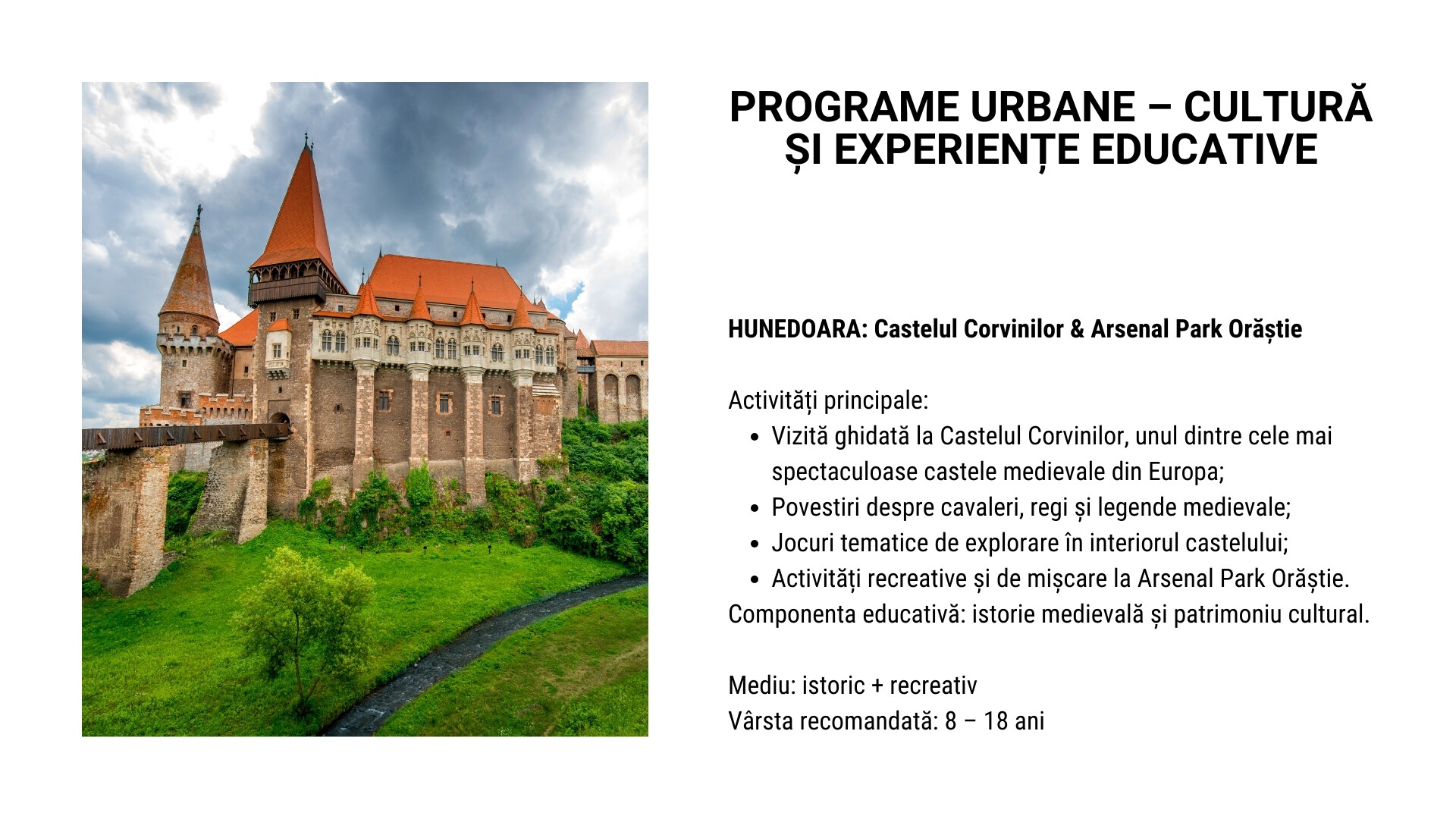 Printre destinațiile propuse pentru astfel de programe se pot regăsi: Sibiu – Gura Râului (Arka Park, Păltiniș), Predeal, vizită la Castelul Peleș, urcare cu telecabina la Cota 2000 – Babele, precum și programe educative în București (Parcul Herăstrău, Muzeul Antipa, Palatul Parlamentului – Casa Poporului, Muzeul Cotroceni).